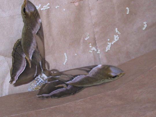 The moths paired up overnight, stayed together all the next day, and unpaired that evening. After they separated, I put the female into a paper bag to lay her eggs.
