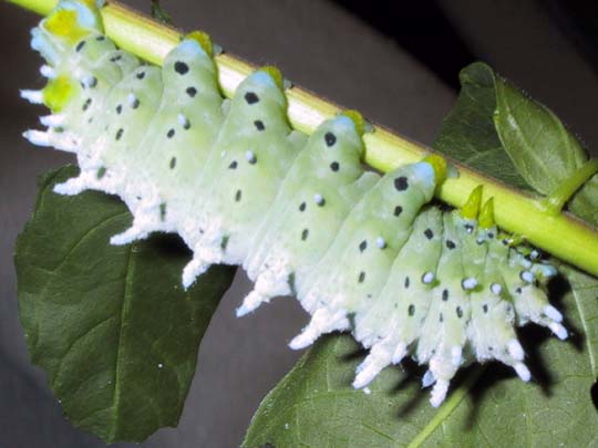 The fifth-instar larva has beautiful blue-green coloring with blue dots on its prolegs. These spun up into tight small cocoons like those shown at the top of the page, and the cycle will continue in the next spring. Cynthia moths only have one brood per season.