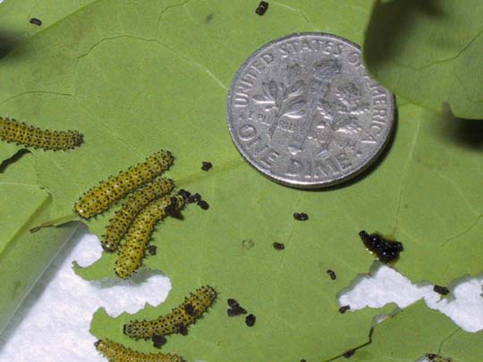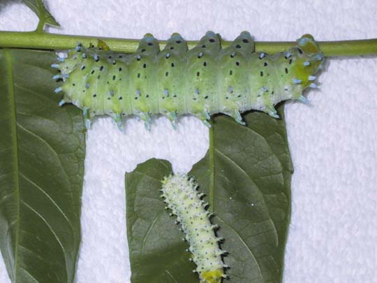 This is from the following year. The larva below is in the fourth instar; the larva above is fifth instar. They did much better with the ailanthus!