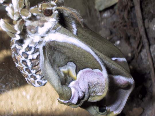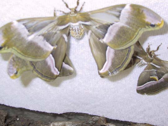 After several amusing failures, the female was finally mated. You can see that the scales on her wings are worn away in spots; this is from picking her up in attempts to hand-pair her with the male on the right. He was totally uninterested. Finally, a new male hatched, and mated with her his first evening; you can see him flattened under her left wings, with one leg sticking up beside hers. June 4, 2004.