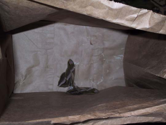 Here, you can see the moth in the bag, with the little clusters of eggs she's laid. I will leave her in here at least one more night, in case she has some more to lay. Then, I'll cut up the paper and place the eggs in a rearing container. June 6, 2004.