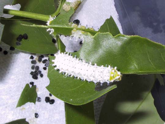 Once they shift into the third instar, they lose the yellowish coloring, and become much more white. I had some problems with disease in this batch. They began to drop off, one by one, and finally all were dead. I've found a source for their native food plant, Ailanthus altissima, and I'll try rearing them again next year on that.