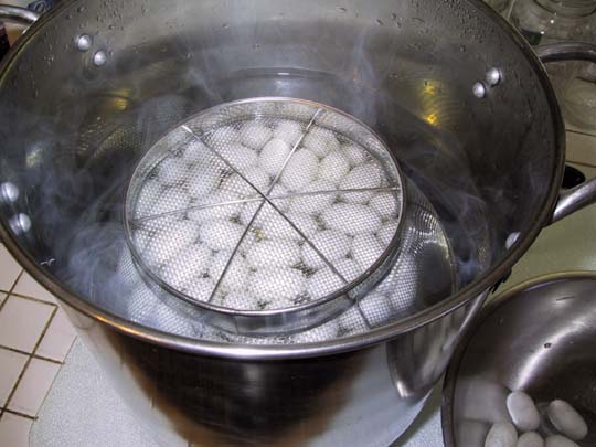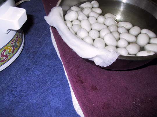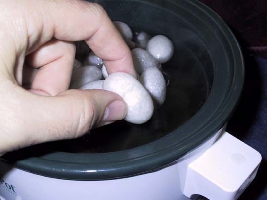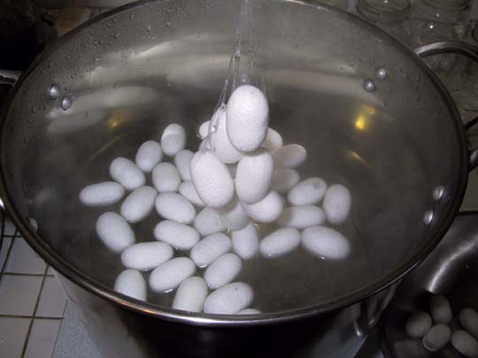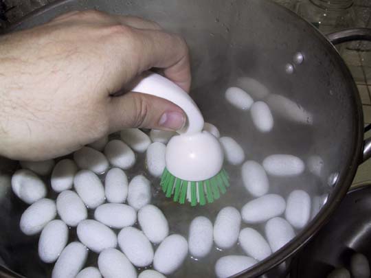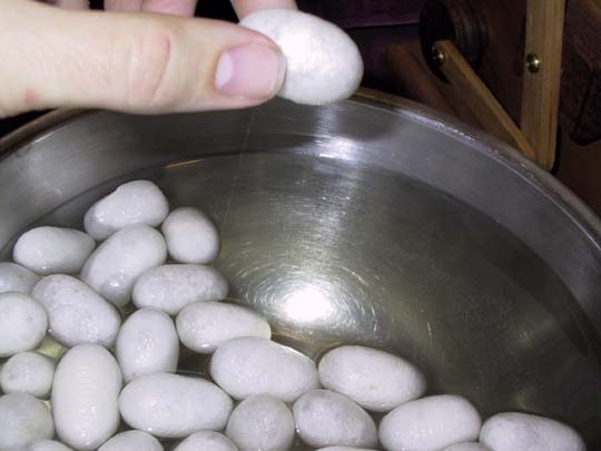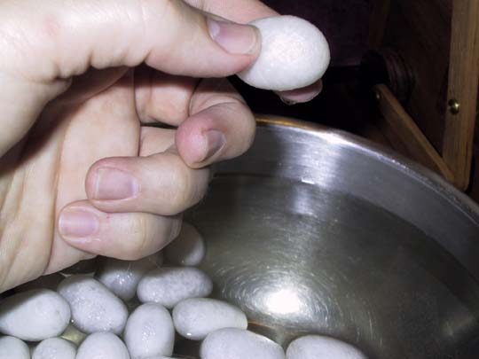 Here, you can see the threads attached to the cocoons. You can find which ones are attached, by dragging them from one side of the kettle to the other, and by watching to see which ones bob around. If you want to see the threads, look in the dark areas right above the bunch of cocoons, against the side of the kettle. Each cocoon's filament is about 2 to 3 denier; a denier is one gram per nine kilometers, or about four and a half million yards per pound. Needless to say, they're very thin.