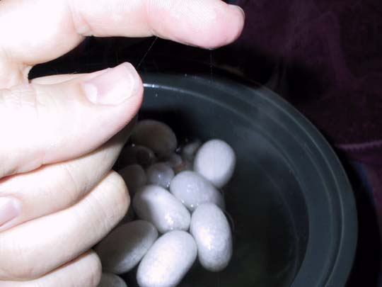 With the cocoon thread captured safely in my last three fingers, and the cocoon held loosely with forefinger and thumb, I flip the hand over, and drop the cocoon into the reeling water. When I turn the thumb side upward, the filament is on the tip of my index finger.