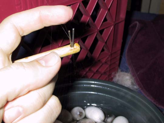 This is what you catch with the brush. You get several cocoons with each swipe, and start pulling the ends from them. As you pull off all the ends together, you will find that they start separating out - some cocoons will drop off, others are clearly connected to the strands in your hand. The strands pulled off during the process will wrap around your hands, cling to your clothes, and get on your nerves. Snap the bundle of strands often, and wipe it off your hands and brush. The silk waste produced by this process is called "knupps", and is used for making silk to spin.
