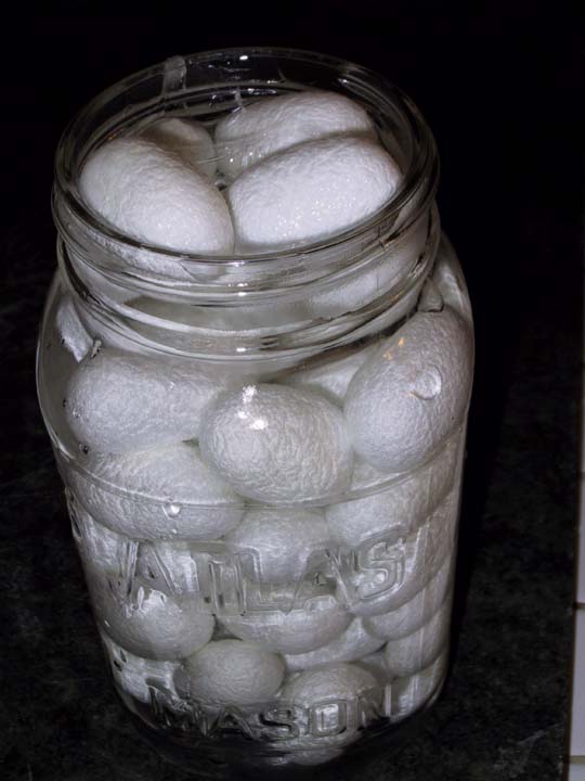 I start out by soaking the cocoons for a few minutes. This helps make it easier to grope the ends, by slightly softening the gum on the cocoons. I start by filling the jar with the cocoons, then with very hot tap water. After five or so minutes, I pour out the water and replace it with very cold tap water. If you try this at home, make very sure to use a tempered Mason jar; thinner jars can't handle the temperature shock. I use a narrow-mouth jar because it helps keep the cocoons down.