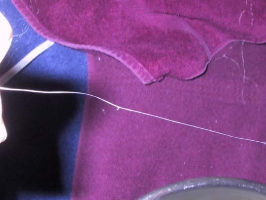 This is how you piece up the raw silk filament. It's in the center there - it's an overhand knot with both strands, trimmed close. The ends need to be just a few millimeters long, or they'll snag later on. In the grading of raw silk, knots over 3mm are considered a minor flaw; over 7mm they are considered a major flaw. With the ends trimmed to 2mm, they are not considered a flaw unless there are excessive numbers of knots.