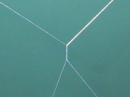 This shows the actual croissure. The filament at the top right is not any thicker than the others, the flash is just catching it. I use about thirty twists; I find that if I use too many more than that, it snaps the filament too easily. Croissure drags on the silk slightly, so if there is a slub or weak spot, it will break the filament. If the filament breaks, you have to piece up.