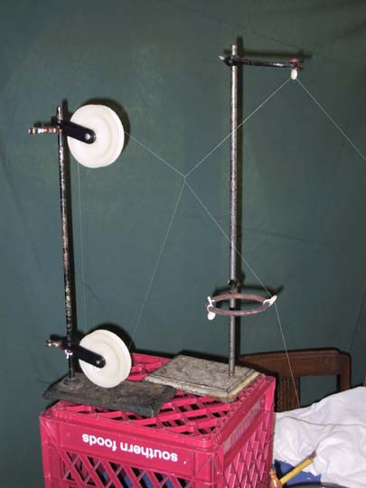 This is a major innovation in my silk reeling process, almost as significant as the improved reel. This is called a Tavalette, or Italian, croissure. Croissure means "crossing" in French - the filament is passed through a series of guides and pulleys such that it twists together with itself, thus squeezing out much of the water and agglutinating (gluing together) the filaments with sericin. The reeling pot is just out of the frame at the bottom right. The filament goes up, through a guide, over the top pulley, around the bottom pulley, through the croissure, and then through the upper guide eye to the reel. Croissure makes a much better quality of silk, because it is less likely to abrade or shred during processing. There is another type of croissure called Chambon, or French; it requires a double reel and double cocoon setup, and one thread from each side is taken into the twist and then they separate to wind on to the reels. Note: the pulleys are laundry-line pulleys, they were around $3.50 each at the hardware store. They are mounted on my ever-present chemistry ring stands, but a dowel inserted into a wood block would work just fine.