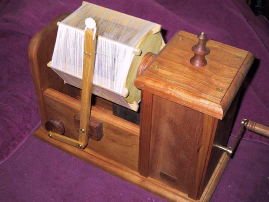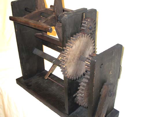 This is the antique Japanese version. The uprights are made of a soft wood, similar to pine, and the gears are carved from a hard wood called Zelkova. The bobbin is called an itomaki, and fits on a removable spindle so that it can be exchanged for a fresh one. Click here for a page on the Zakuri, including specific and careful measurements.