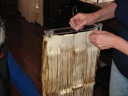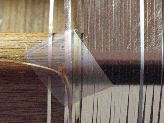 It is treated with a special laquered surface. The best traditional stuff is leafed with real gold, silver or platinum. The student grade is a synthetic, but looks pretty gold-y. The warps are made of rice paper, and are hand-cut with a special tool. The one I'm using is 35 cuts per each 3.3 centimeters - which works out to about 25 ends per inch.