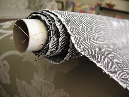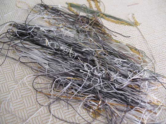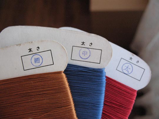 The weft is a special kind of silk; it's a highly twisted 3-ply organzine. I'm guessing around 600 denier, for the weight I'm working with. There are three sizes here; they are marked at the top with a Japanese symbol that indicates the size. I'm using the medium-sized weft, like the blue in the middle.
