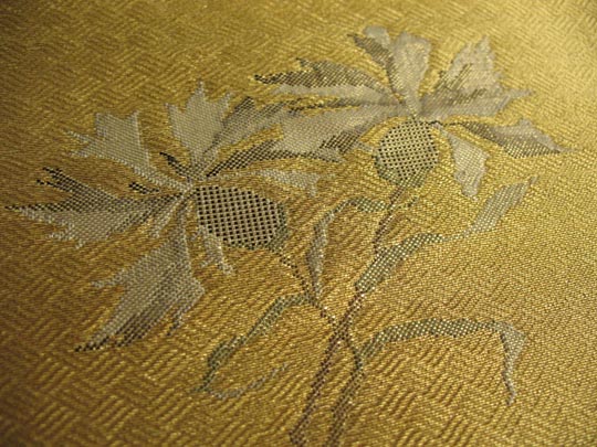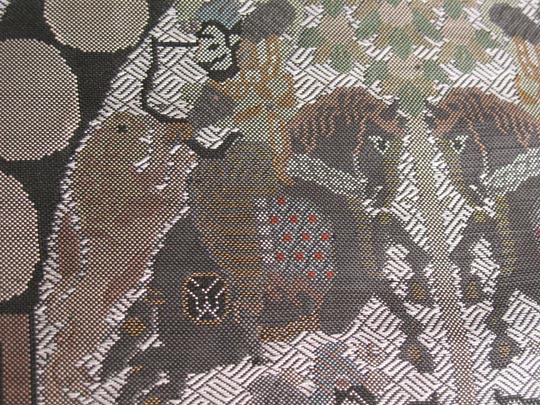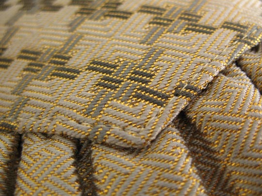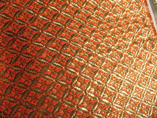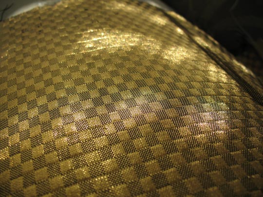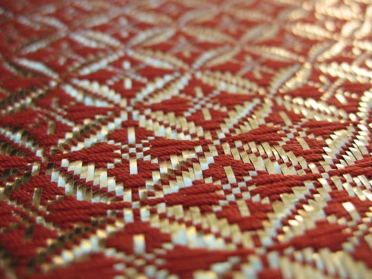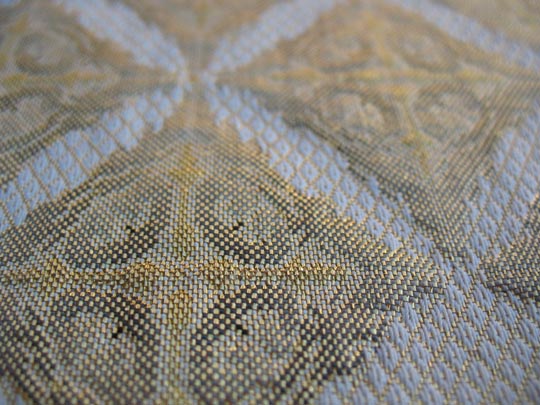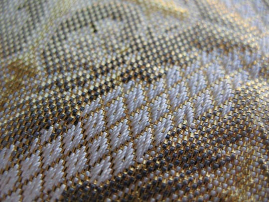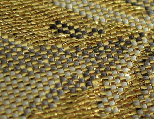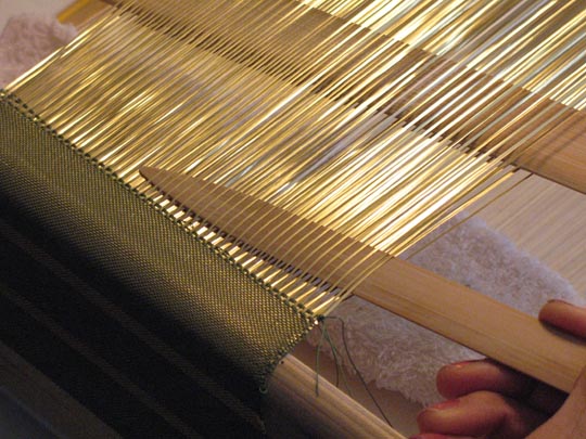 These are difficult to light properly for photography, because bright light tends to glare off of the gold. It's amazing the sheen that comes off the warp threads in the sunlight.