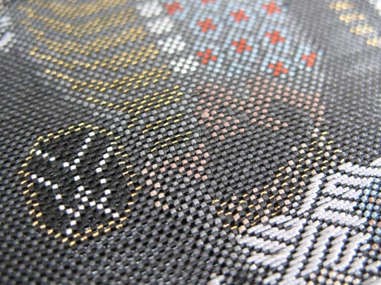 The back is just a dizzying pile of extra strings. Some of them appear only briefly in the surface. Mihoko said that in the complicated parts of this pattern, she would only be able to pick 2 or 3 rows in a six-hour day of weaving.