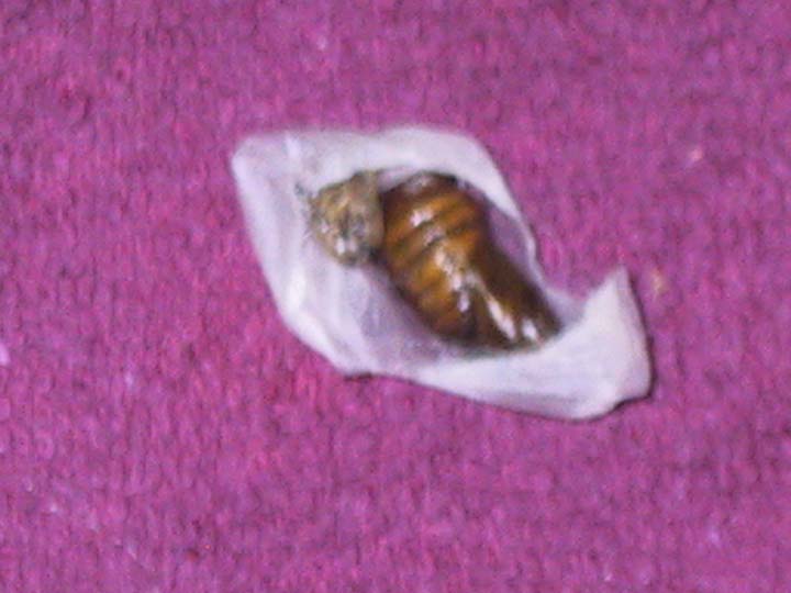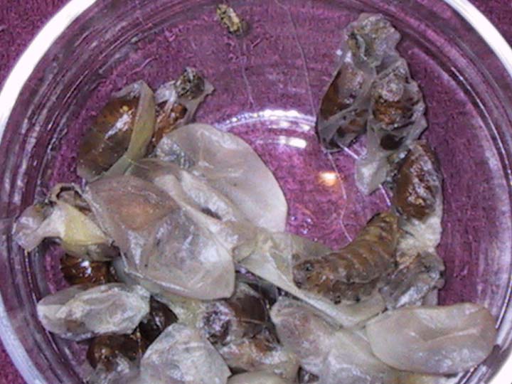 I take the pupae out and discard them. They can be composted, and are useful as fertilizer.They're an important source of protein for many countries, though. As Chris pointed out earlier, they are not delicious to the tastes of most Westerners. I have eaten one, just to check. Really. Tastes like bug. If you don't raise them yourself, I wouldn't recommend eating them - they will be even less tasty if they're not fresh. If you want to read more about silkworms as food, you can click here. If you want to learn more about the rearing and handling of the silkworms themselves, check out my rearing page.