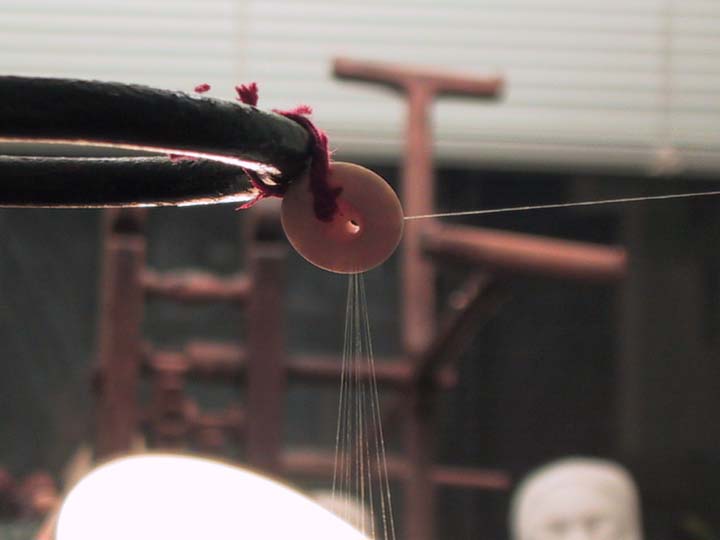 Closeup of the button. You can see where it's tied onto the Bunsen-burner stand with a twist-tie, and the other hole has the threads going through it.Then, I attach the thread to the reel, and begin reeling the cocoons.