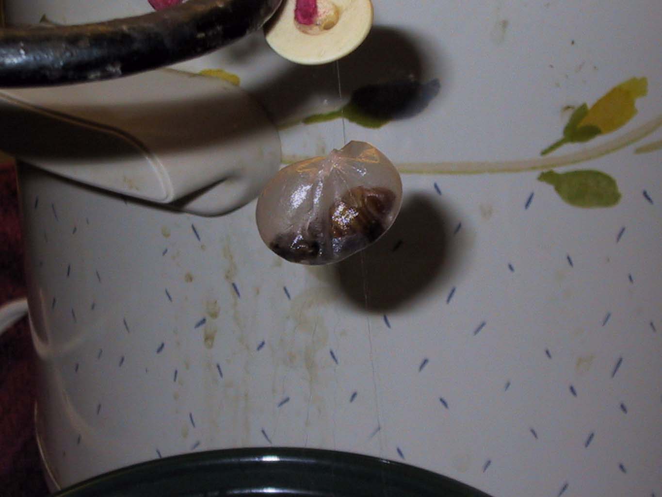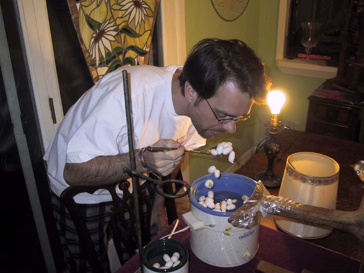 As the reeling progresses, the cocoons become thinner and thinner. You can see the bug inside many of them. When you've reeled all the usable silk from the cocoon, they will either drop off in the water, or fly up the thread, sometimes with a surprising wet splat.