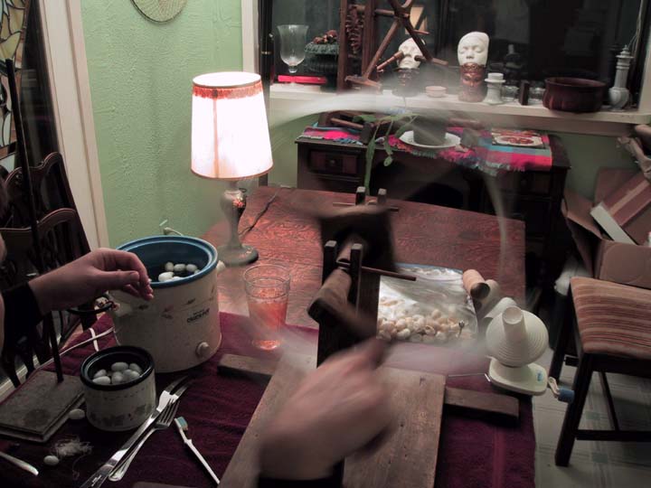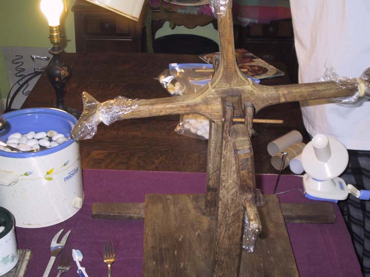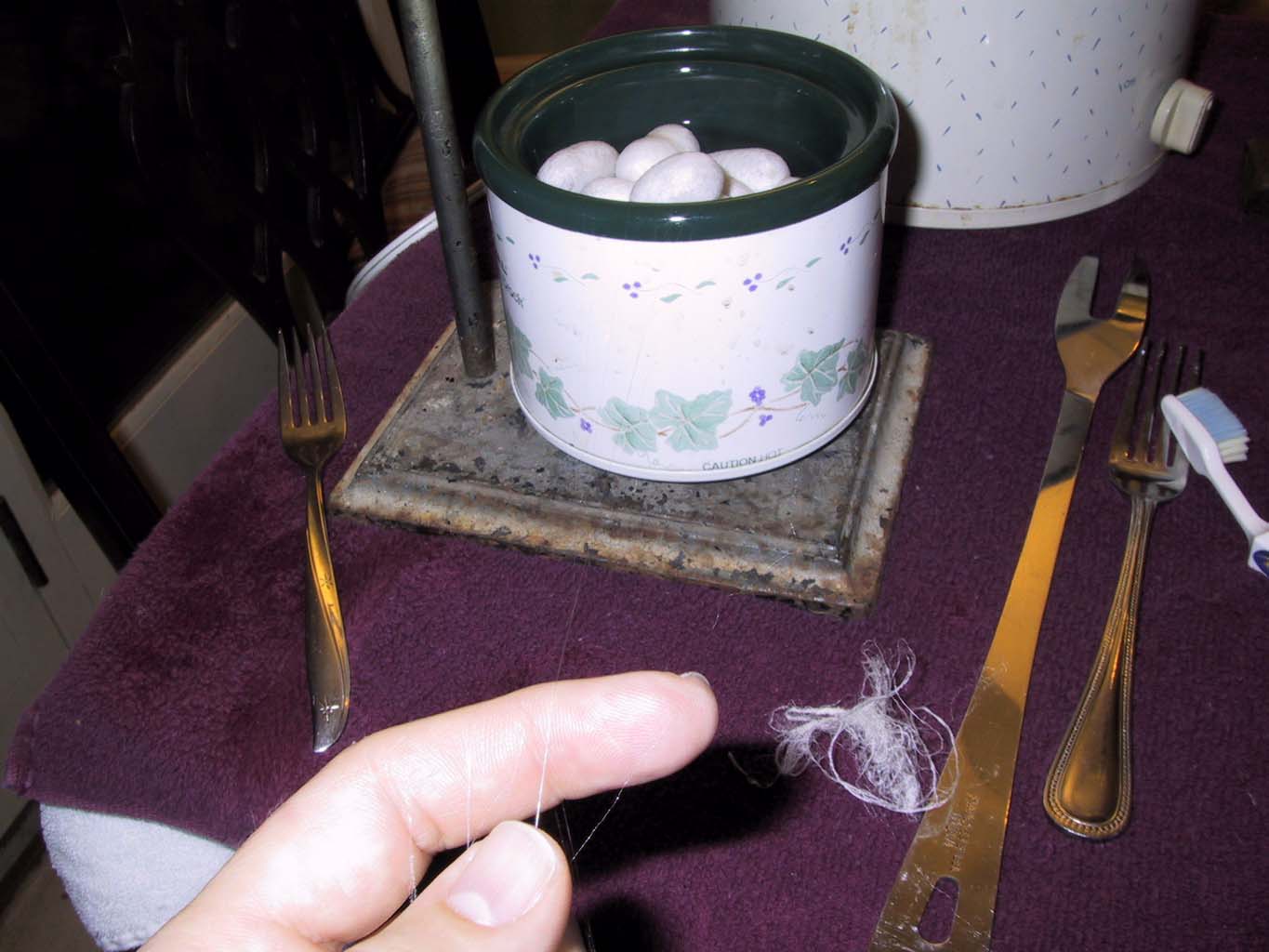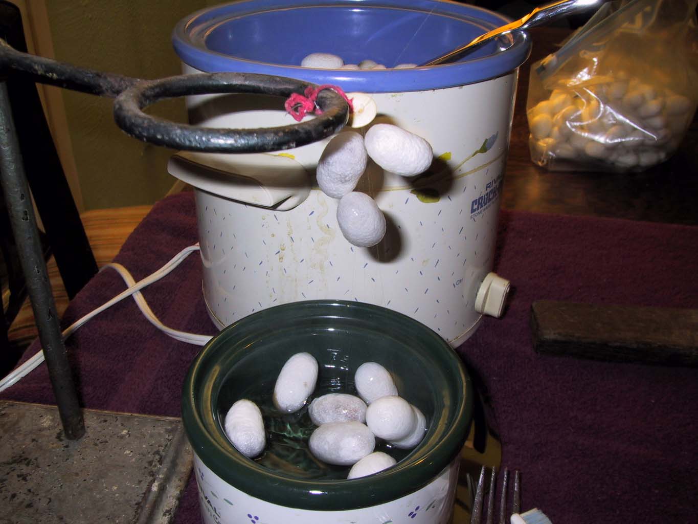 This is most of the basic setup. There are two crockpots, one for pre-heating and one for the cocoons that are being reeled; there are forks and slotted spoons, there is a reel (from the 1850's, we're guessing) and a ball winder, and lots of cocoons. The work surface is covered first with plastic bags, because the cocoons drip, and then with towels. Silk will get *everywhere*, and if you don't have something like a towel handy to wipe your fingers on, it's almost impossible to get free of it.