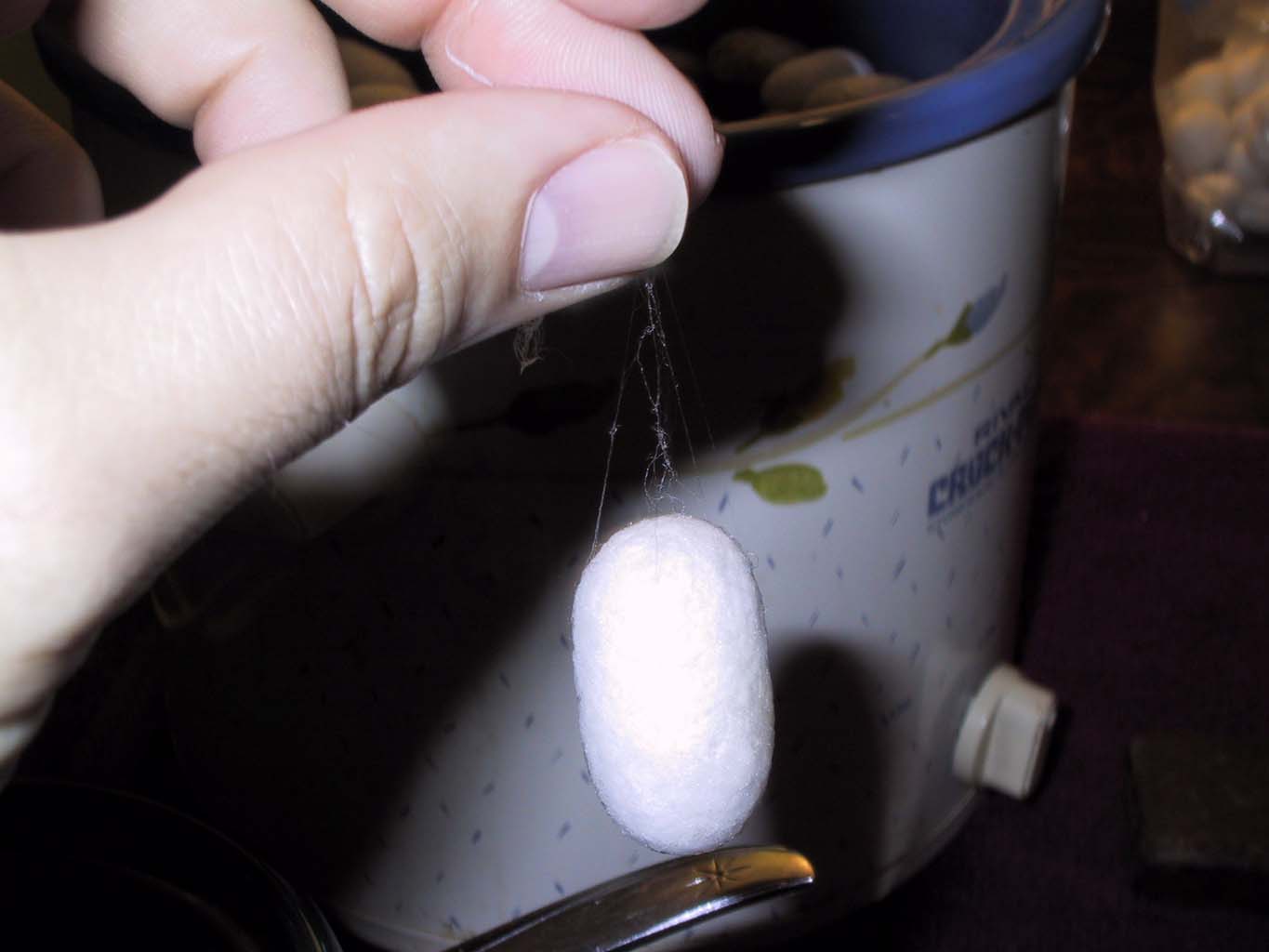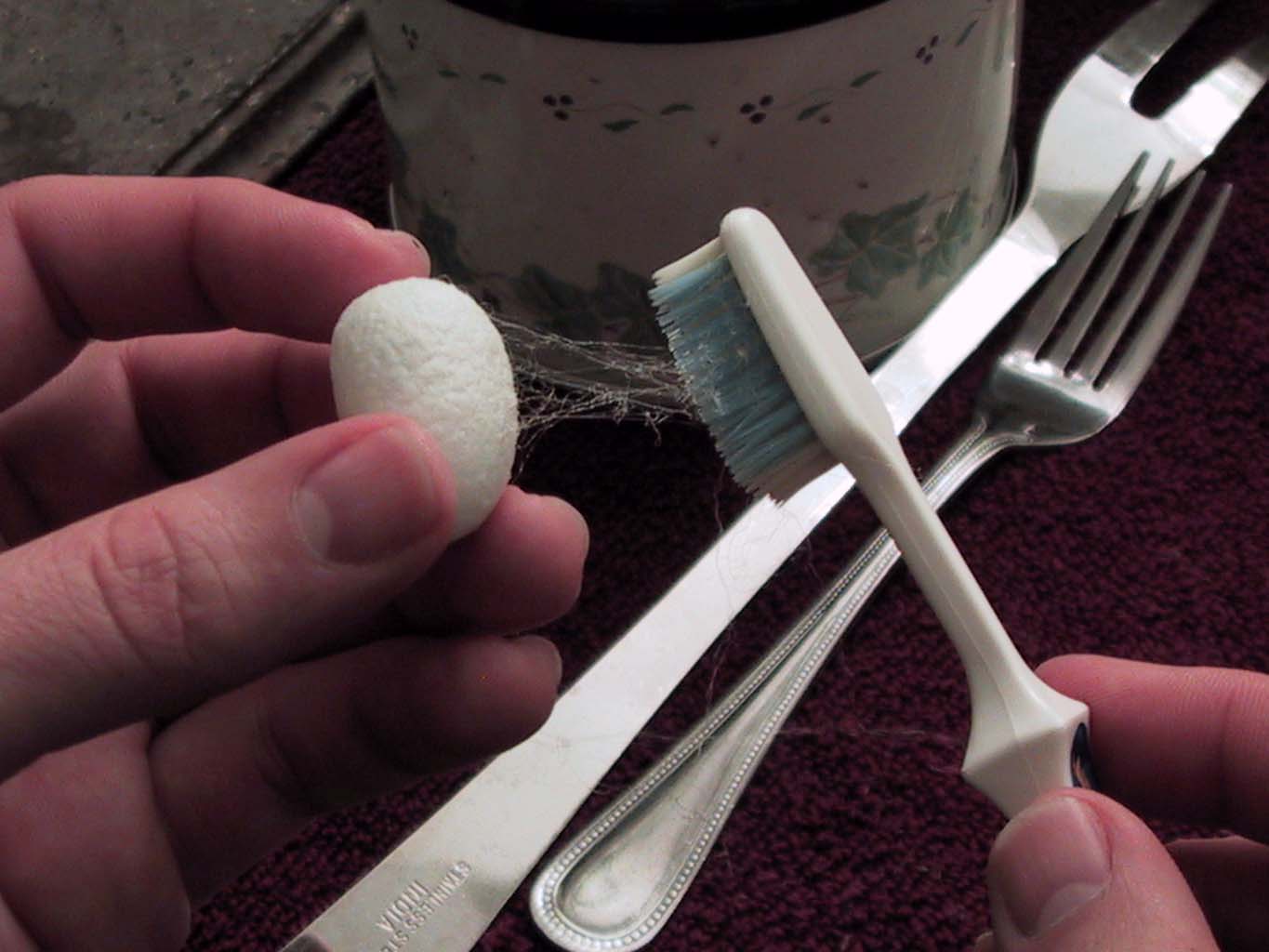 I begin by simmering the cocoons in the hot water. They need to get pretty drenched, but they don't need to boil at all. We call this "Pupa Soup." It smells like dead bugs, because, well, dead bugs. Once the cocoons have loosened up a little, and maybe you've held them under the water with the spoon until they stop fizzing, then you can start the Quest for the One True Thread. Each cocoon is made from one thread. The trick is finding it. You start with the toothbrush, which is like taking apart a ball of yarn with a serving fork. You separate out a lot of dead ends, and then you hopefully find the Right One.