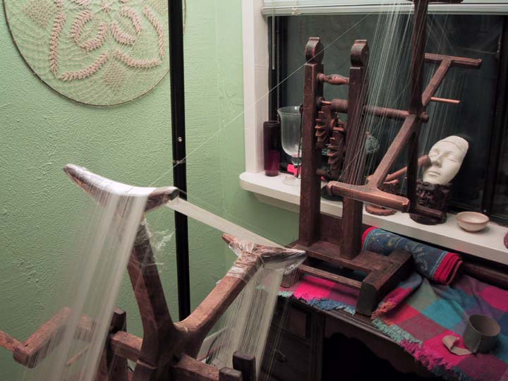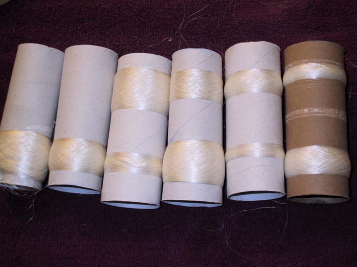 When the silk is all reeled on, it's time to re-reel. Sometimes this goes directly to the ball winder, but I decided to try putting it onto another clock reel first. It seems to help reduce breakage, because of the angles and the winding mechanism.Here is the silk being wound onto a toilet paper tube. After enough tubes are made up, they will be reeled together into one thicker thread, then dyed and used for stitchery or weaving. If desired, they can also be twisted using a spinning wheel, a process called "throwing."