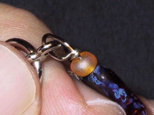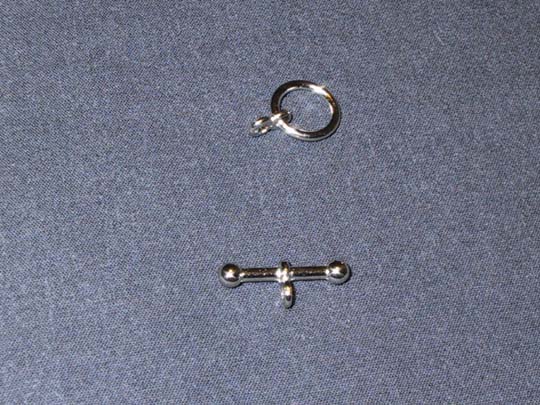 I thought about starting with spring rings or jump rings to go on the needles. But, when I was shopping for the supplies, I found these very cool little "toggle clasp" closures; they're designed for necklaces and bracelets. Because they're solid rings, they won't catch on anything, won't come apart, and won't end up with yarn inside them. And, they've got convenient little attachments already on them to attach the beads to. The toggle rings that I used will fit up to a size 10US; there are bigger ones available, but these looked best for what I want. And they were cheap.