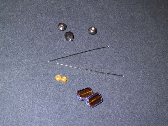 These are the other supplies. The top and bottom are beads; you can use whatever kinds you like, or use charms, etc. Keep in mind, that if you put a lot of large beads, your markers will be heavy, and if you use pointy charms or beads, they may catch on your work. The long pointy things in the middle are "head pins" - they are like brass straight pins with no points. They are used to mount the beads to the ring.