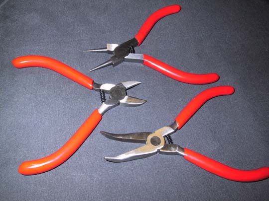 These are the tools I used to make these. Top to bottom: round nose pliers, side cutters, bent needle nose pliers. Any needle nose pliers will work, although the round nose really do help with getting the shape of the loop to be nice.