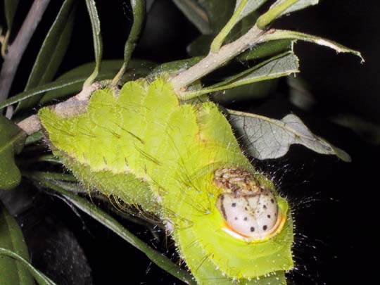 This is a fourth instar caterpillar; it's the same age as the one waiting to drop its face, but has made it to the next stage already. They have beautiful green faces. Other than the face, though, you could easily mistake them for a Tussah caterpillar.