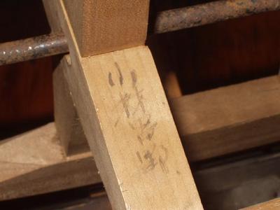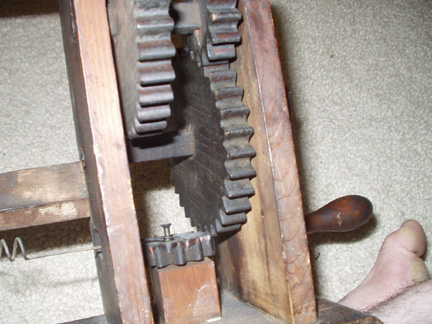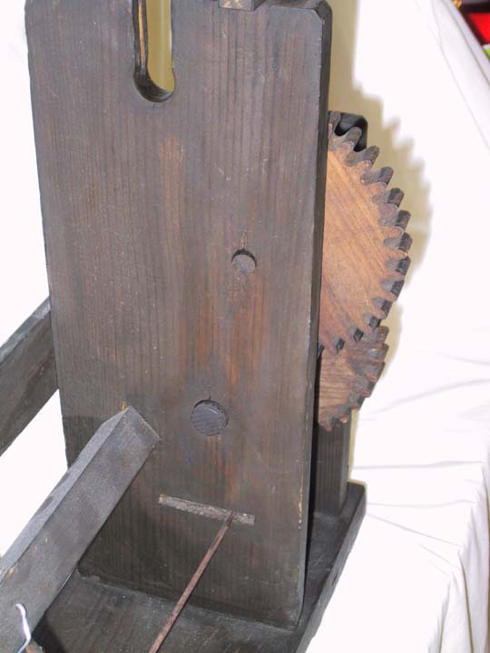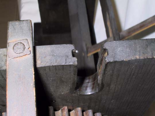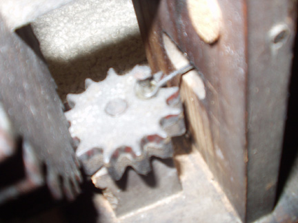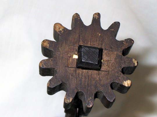 In this photo, you can see the sliver holding the gear in place; I've replaced a missing sliver with one made of a poplar, which shows up bright white.