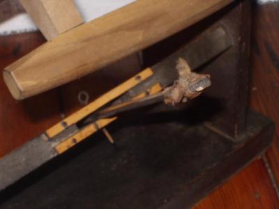 The rocker arm is made of bamboo. It is 9" long, 1/2" wide, and a scant quarter inch thick. I have attached a bone button with a piece of wire to guide the thread; it would have had some other form of guide, possibly made of hair, that was not with the machine when I bought it.